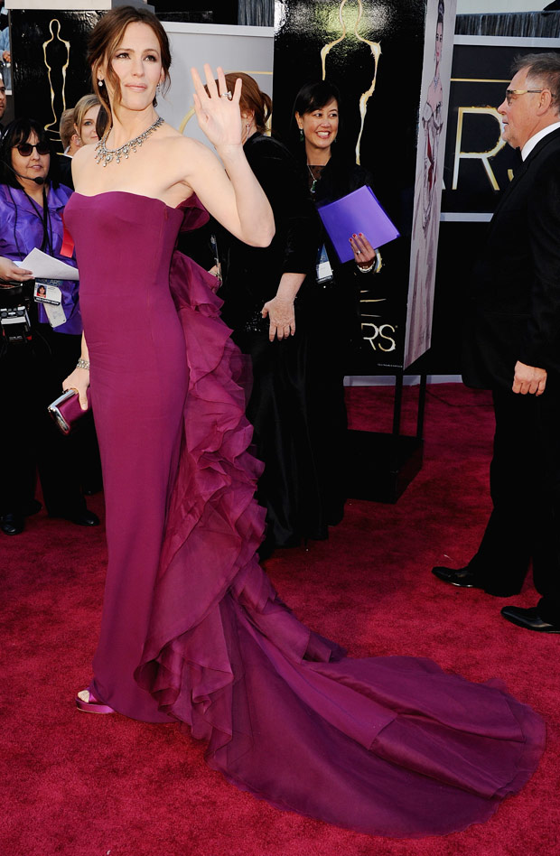 in the midst of neutral & blush color dresses, mrs. affleck stood out in this exquisite plum dress with giant ruffles down the back. her soft tousled hair & stunning diamond necklace complimented the dress perfectly, showing the world that this mom of three can still turn up the glam.